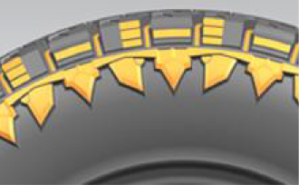 外觀富有立體感,更加強壯,為胎側(cè)提供有效防護,提高耐撞耐刺性能;花紋溝底部增加彈石子結(jié)構(gòu),保證花紋抓地力 。